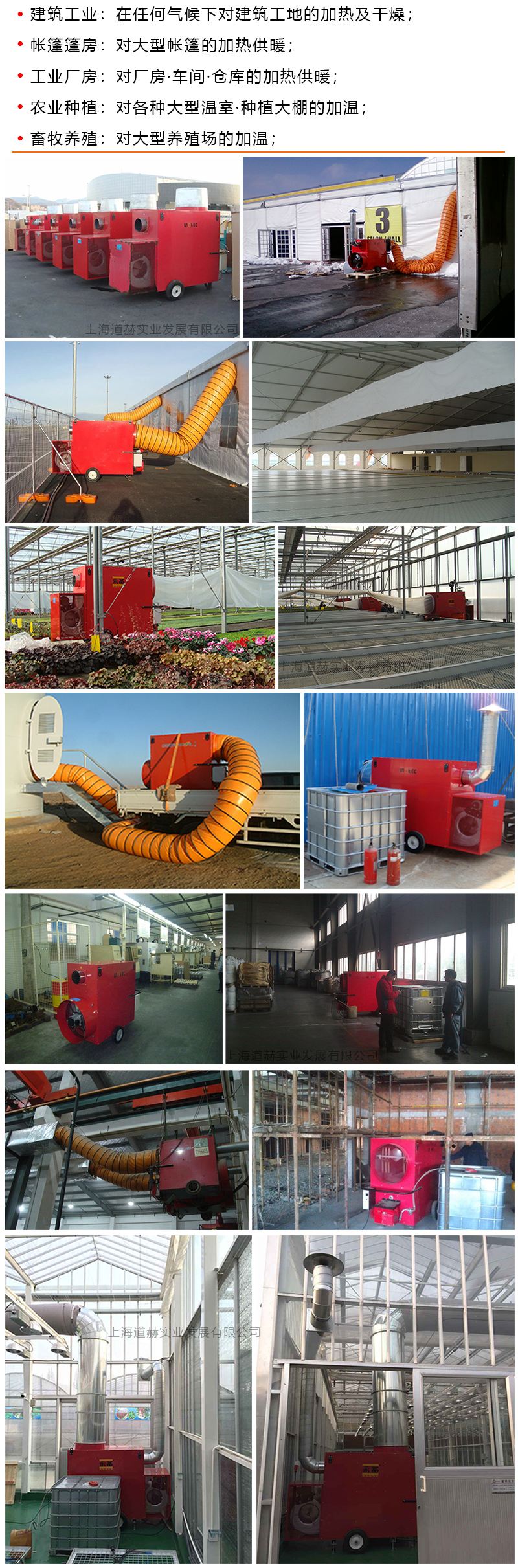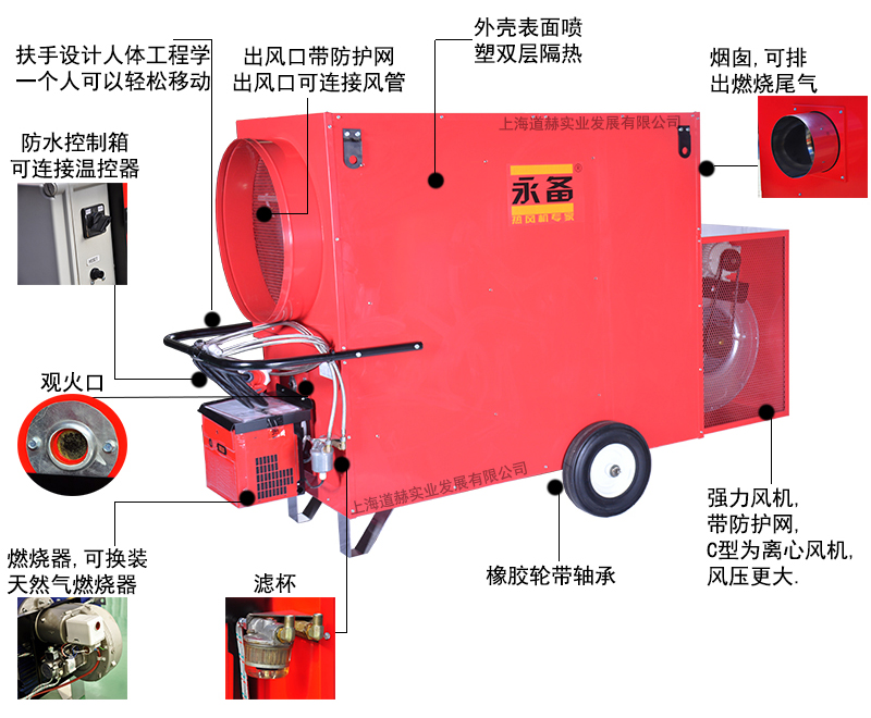 2.燃燒產出的熱量通過熱風機后部的強力風機把熱量吹出